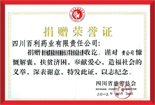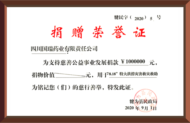 2020年8月18日,四川省犍为县遭遇百年未遇特大洪涝灾害,云开体育网页版登录入口-云开(中国)集团国瑞药业向犍为县灾区捐赠现金100万元。